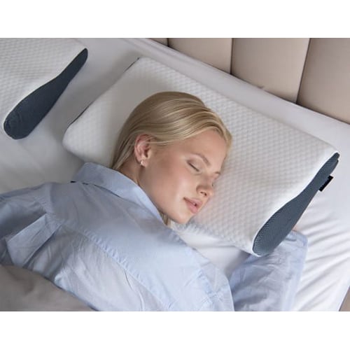 Die Kombination aus ergonomischer Form und anpassungsfähigem Memory-Foam verteilt den Druck gleichmäßig und entlastet besonders bei Seitenlage Schulter- und Nackenbereich. Das sorgt für ein ruhigeres, entspannteres Liegegefühl.